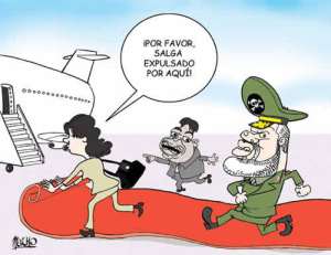 This cartoon appeared in La Prensa, shows the red carpet and how politely he is being asked to leave. The Israeli government issued a strong communication, questioning this government’s behavior. To me, it is a surprise to see our female Defense Minister inviting someone who represents cave-men who despise women. It is not a secret how women are treated in that country. It is sad to see how some public officials become scape goats and do whatever they are asked and forgo their ethics, morale and common human principles.