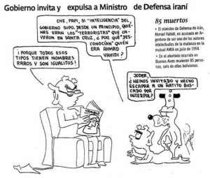 This cartoon appeared in Los Tiempos. Title reads “Government invites and expels Iran’s Minister of Defense.” The dialogue between father and son with final remarks from the dog. They question why the government did not know who this person was, as in the past, when they knew ahead of time about the alleged terrorist who came to Santa Cruz over two years ago. While the dog is thinking that we invited and let go a criminal sought by the Interpol.