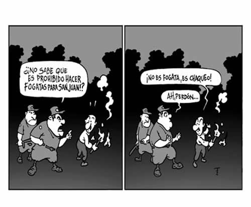 El Dia newspaper published this cartoon on June 30, 2011. There are two policemen questioning a person “Don’t you know is forbidden to put up fires in Saint John?” Saint John (San Juan) is celebrated with fires on the night of June 23rd, people jump over fires, eat hotdogs and drink warm beverages, as it is regarded as the coldest night of the year. In the second part of the cartoon, the person replies “It is not a fire, it is chaqueo!” and the police officer says “I’m sorry…”