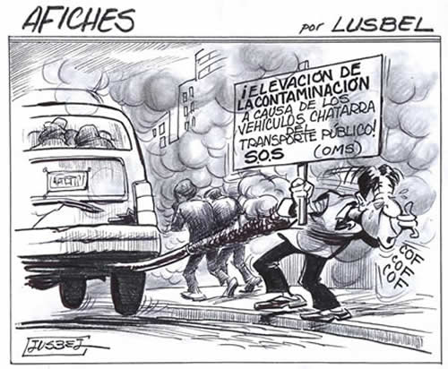 This cartoon appeared in El Diario on July 20, 2011. A car is polluting the streets and the pedestrians are covered in smog. One of them, coughing has a sign: “Higher levels of pollution, caused by junk cars used in public transport” At the bottom of the sign, on both corners the help SOS (help) and WHO (World Health Organization) are displayed.