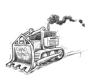 This cartoon (El Dia, Aug 2, 2011) illustrates how the government is behaving regarding this road that will cut in half this protected area. The bulldozer has up-front a sign “Bye TIPNIS” and by the side a box “Mister Indigenous, place here your consultations”