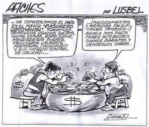 This cartoon is from El Diario ( Aug 2, 2011). It shows how few people get rich thorough illegal imports and basically recycled, trash goods. While both of them are seating in front of a big pile of money, they are counting lots of money.