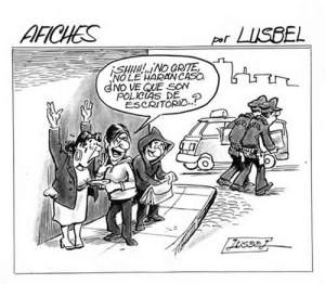 This cartoon appeared in El Diario, August 4, 2011. It shows two smiling thieves, a frightened citizen and two policemen passing by with filing folders under their arms. One of the thieves says: “shss, don’t yell, they will not notice you, can’t you see they are desk police?”