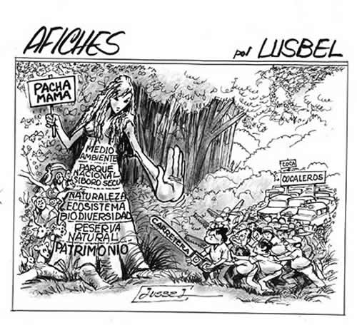 This cartoon appeared in El Diario (8/9/2011). You can see the “Mother Earth”, “environment” as “Pachamama” (the name that identifies Mother Nature in Quechua and/or Aymara). She is trying to stop current Bolivian president who is at its bottom with a chainsaw (labeled as road) and is in front of a large pushing coca growing farmers group; and many road vehicles. Her dress/shape tree form has the words “environment, TIPNIS, nature, ecosystem, biodiversity, natural reserve and patrimony”; behind her all the frightened wildlife. The stakeholders worldwide are beginning to notice this issue and wonder what will be the reaction of this government.