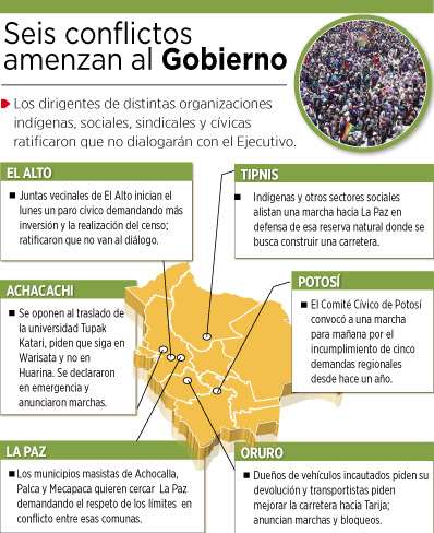 - La Paz: Three municipalities that are headed members of current political party in the national government are threatening to block La Paz City. They are Achocalla, Palca and Mecapaca; they claim is for border conflicts with the main city. (It could also mean that those municipalities are being used to “fight” the municipality of their former political ally, the MSM party.