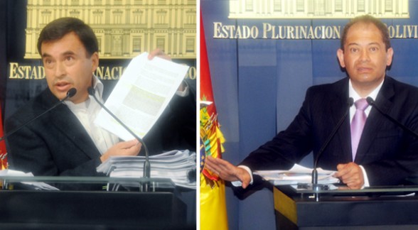 The picture of both appeared in Los Tiempos website, at 17:57 hrs, 8/25/11. It is confusing as Quintana (left) called a press conference in the official podium at the “Burned Palace” and now we know he was delivering a personal opinion.