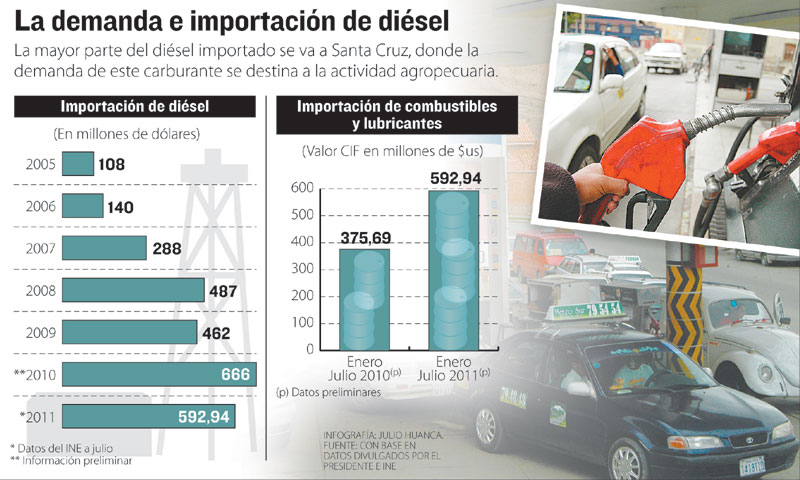 $2,151 billion dollars represents diesel import over the last six years. To date, natural gas, gasoline, liquid petroleum gas and diesel are subsidized. When minister of hydrocarbons and energy, José Luis Gutiérrez, was consulted about how the government was going to allocate more funds for those subsidies, he avoided the subject and asked to “transfer” the question to the economics minister, Luis Arce Catacora.