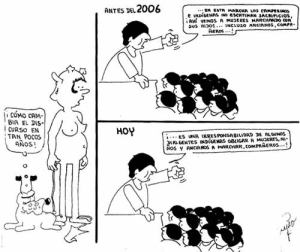 This cartoon summarizes how Bolivian society has seen how speeches vary according to political times, same people have different views and still try to pose as the immaculate leader that only sprays wisdom…