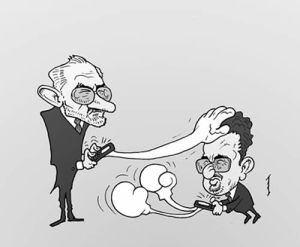 This cartoon is from El Dia, the taller figure is former Vice president and after that President of Bolivia, historian and journalist Carlos Mesa, the smaller figure represents current Government minister and former Director of the Human Rights in Bolivia, Sacha Llorenti (the size of each of them is metaphorical, in line with prestige and accomplishments.)