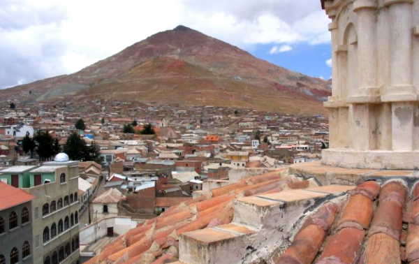 Bolivian most visible and recognized emblem around the world, for at least the last 500 years is falling down, because of the indiscriminate and unregulated mining activities: the last recorded submersion of 38 meters of radius and at least 40 meters deep, took place this January close to 4,400 meters above sea level, on top of this mountain. Around 700 mining workers may have to be relocated to other places below that level. [This photo shows a dent on top, which was nonexistent over thirty years ago, I saw a perfect and beautiful triangle back then. This Cerro Rico has given a lot of wealth since colony times, for Spain and for the construction of the whole Republic.]