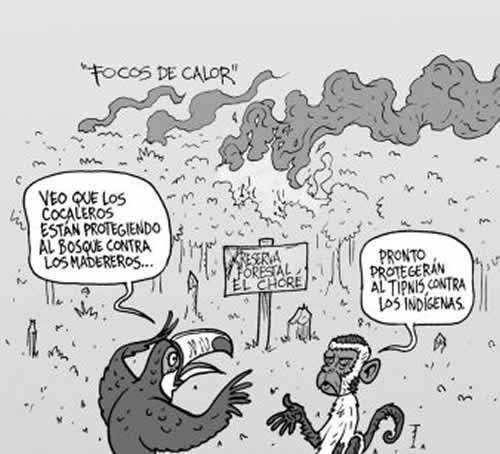 This cartoon is from La Razon, September 6, 2011. As you know, uncontrolled fires are polluting Bolivian air. The cartoon reads above “heat spots” Between the animals talking you can read “Forestry Reserve, El Chore” The toucan says “I can see the coca growers are protecting the forest from the loggers” and the monkey replies “They will soon protect TIPNIS against the indigenous people.”