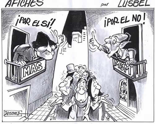 This cartoon from El Diario, best reflects how Bolivian society reflects regarding the questioned elections for the Judicial System in Bolivia. While current president and his political affiliates are engaged in a campaign to endorse and advocate the elections; former ally Juan del Granado and his political party MSM are campaigning to vote NO and nullify the votes.