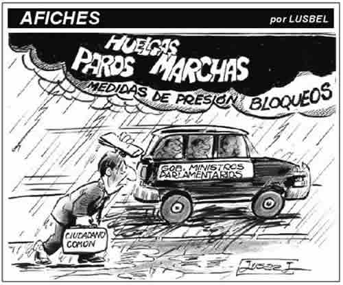 This cartoon is from El Diario, 9/13/11. It shows how common citizens perceive the problems we face daily. There are black clouds filled with strikes, marches, protests, pressing measures, blockades. While government officials, ministers and congressmen do not suffer as we do.