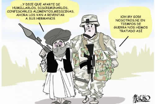 This cartoon is from La Prensa (9/21/11), in a far away place two “recognizable” characters are saying: “…and he says that aside of humiliating, discriminating, confiscating their food and medicines, now they are going to “explode” their brothers” and the soldier says “Oh my God, we haven’t treated like that, not even in war-time!”