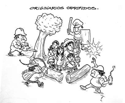 This cartoon is from El Dia (9/21/11), it reads “Oppressed Indigenous” the TIPNIS protest-walk group is surrounded by illegal loggers with chainsaw, high landers with dynamite, policemen with clubs and shields and coca growers with whips. This protests group is surrounded, deprived from water which is nearby and food supplies were not allowed to reach them. In the capital cities of La Paz, Cochabamba and Santa Cruz, the common citizen is delivering food, water, money in the main plazas of those capitals, hoping those supplies can reach the marching group sometime soon.