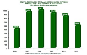 Between 2006 and 2011 (as of July), remittances to Bolivia from other countries totaled $4,810 million dollars; there was a growth in remittances of 67%.