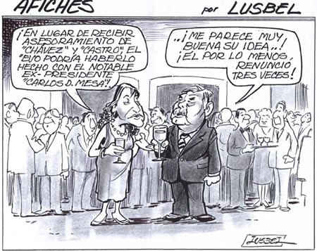 This cartoon is from El Diario (9/27/11), two people talking: “instead of receiving assistance from ‘chavez’ and ‘castro’ the president could have received advise from the notorious former president ‘Carlos D. Mesa’!” and the reply: “I think it is a good idea…! he (Mesa) at least resigned three times!” [In clear reference to Mesa’s offers to leave office when his presidency faced turmoil. Bolivian protests in support of TIPNIS, yesterday, shouted (as in the Bolivian twitter community and other social media) current president should leave office].