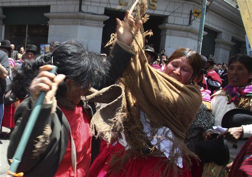The supporters of current government were questioned by citizens and there were insults, and some punches back and forth; the supporters of the government also spit their coca chewing and hit the bystanders with their whips. The TIPNIS protest-walk and the violent police repression was the source of the confrontation. Anarchy has taken the streets, which reflect current political deterioration of the president and the rest of his party affiliates wiht the majority of the Bolivian society who support the TIPNIS indigenous people.