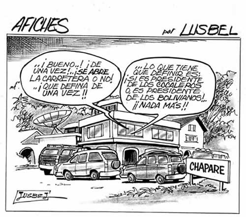 This cartoon is from El Diario, it portrays how the Chapare region where coca leafs is grown. Some months ago, a TV program showed many luxury vehicles, satellite dishes and fancy homes across that region; most of Chapare’s wealth comes from coca leaf related trade. In this cartoon people are talking inside, one says: “..! well…! For once and for all!.. the road is going to open or not!…(he) should define at once!!” and the other person says: “..what needs to define is: is he is the president of the coca growers or is he the president of the Bolivians!.. nothing else!!” This dialogue, is in clear allusion of current Bolivian’s dual role and if the TIPNIS road will be built or not.