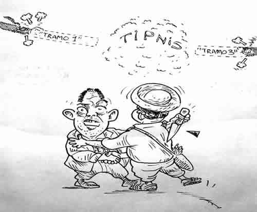 This cartoon is from El Dia, up above, there is a drawing with caterpillars working on segments one and three of the road; in the middle is the TIPNIS forest, considered as segment two in question (construction in one and three is actually happening). The person, who intends to stab the indigenous person on the back, resembles the minister of the presidency, Carlos Romero. This cartoon directly makes reference on the speeches that government officials make and their actions.