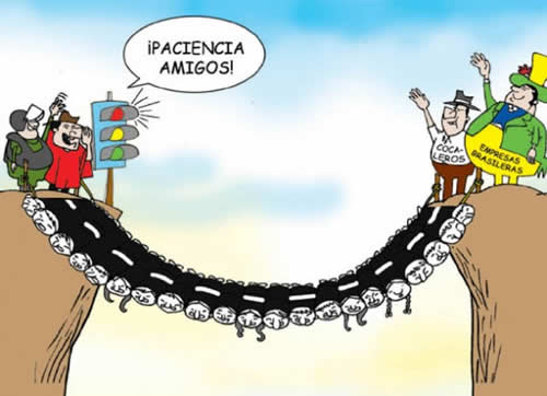 Finally, this cartoon is from La Prensa, shows on the left side a police officer and a person in a red poncho, which represents the radical and violent group of Aymara people from Achacachi saying “patience friends!” to their side is a traffic light which is currently in red. Then, there is “paved bridge” of people who are supposedly the TIPNIS indigenous group who are represented as defeated. On the right end, two smiling people are waving; one representing the coca growers (cocaleros) and the “prosperous” gentleman portrays the Brazilian companies (in charge of the construction of the polemic road).