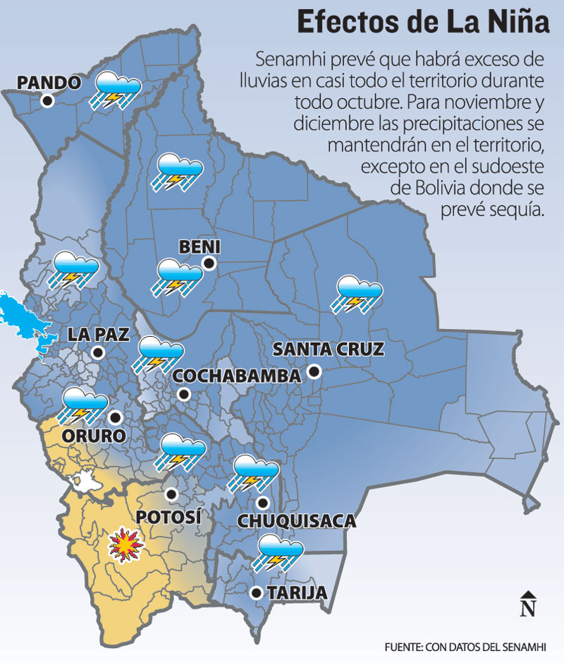 Bolivia will expect excess rain in most of Bolivia for October,2011; during November and December, rain will continue everywhere but southwest Bolivia (parts of Oruro and most of Potosi) where there will be draught, reported the Meteorology and Hydrology National Service (SENAMHI) to La Razon.