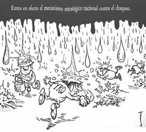 The cartoon shows heavy rain hitting on those who are supposed to control de fires and those who provoke them. The caption above reads: “Enters in force the national strategic mechanism against slush and burn practices.”