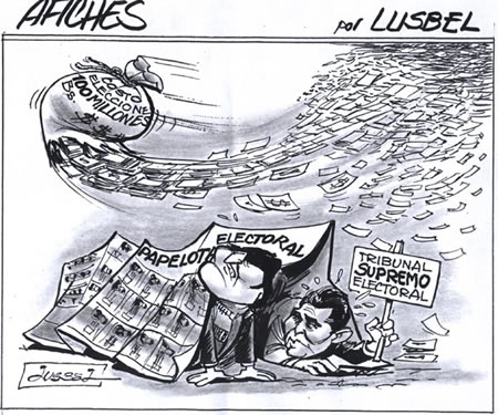 El Diario cartoon illustrates today the way public opinion feels about this “election:” high cost for a not-so-clear and non-transparent election. Over 100 million Bolivianos were spent, in the cartoon you can see current Bolivian president and the head of the electoral office being covered by th humongous electoral ballot as they watch money flying away. Carlos Valverde (tv program last night and radio today) among other journalists and analysts say president’s face still shows disaster and contempt over what most people qualify as the worst electoral campaign ever lost by current political party since 2005. President said valid votes were going to be around 70%, it appears that the 70% figure will be reached, but with empty and null votes…
