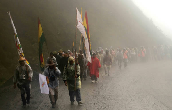 This is day 63 since they left Trinidad. It is over four thousand meters above sea level, tonight they will rest 15 kilometers away from La Paz. Their intention is to go to Plaza Murillo by noon time; this Plaza holds the Executive palace, National Assembly, the Foreign Affairs Ministry and the Catholic Cathedral. CIDOB’s president Adolfo Chavez reports that Minister of Government, Wilfredo Chavez did not confirm the marchers could enter Plaza Murillo; Adolfo said to El Deber’s reporter, Ruy D’Alencar that they will try to get in.