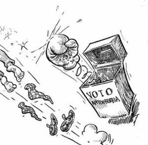 Going back to the cartoon, the punch comes out of a ballot box which reads “anti-arrogance vote,” in clear allusion of how current political party, the president of the coca growers and the State of Bolivia behavior. They were so sure of what they called their triumph with over 60% of valid votes. Until the official figures are known and the electoral office passes the audit many opposition politicians intend to conduct, the empty and null votes continue to be larger than the valid votes.