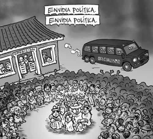 This cartoon, published today in La Razon, shows the envy that both opposition and government political parties felt about the apotheosic welcoming La Paz citizens gave the TIPNIS indigenous protest marchers since the time they arrived and also when they left (to date, 300 remain until the law that enforces their rights over the TIPNIS is passed in the National Assembly). Furthermore, support, respect and caring demonstrations of sympathy nationwide over the indigenous group are the envy of any Bolivian politician (LOL).