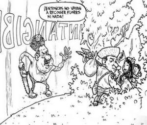 The cartoon on the left is from La Razon, October 28, 2011. What is now perceived as a “white elephant gift” has begun to raise polemical discussions. The concept of “intangible” as to what it represents, whether to its extent, its limitations on indigenous people and the use of the natural resources. In the cartoon, the word intangible appears as a barrier and an illegal logger with a chainsaw shouting “so, don’t even pick up flowers, nor nothing!” as the people are going inside with pride and joy.