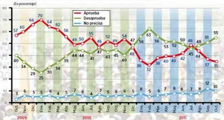 This chart shows the approval percentages in red; disapproval in green and does not respond (blue); please note the trend… figures from October 2009 to October 2011.