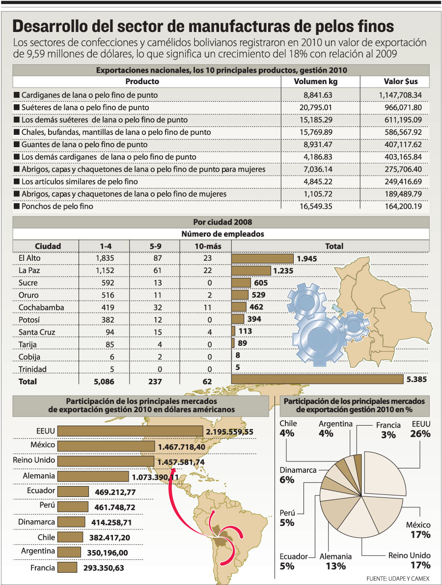 In Bolivia, the camels and clothing sector in 2010 registered an export value of 9.59 billion, up by 18% as compared to 2009. Until August this year, it exported 6.06 million dollars, an amount exceeding by 17% over the same period in 2010.