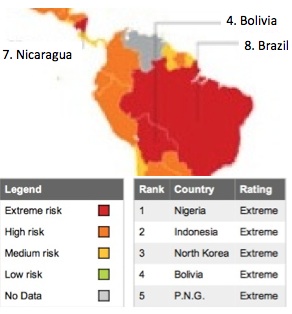 The Deforestation Index, released by risk analysis and mapping company Maplecroft, states that economic growth, poverty, corruption and the rise of biofuels are among the major causes of deforestation in nine countries which have been classified as ‘extreme risk.’ These include Nigeria, Indonesia and Brazil, as well as Bolivia, Cambodia, DR Congo, Nicaragua, North Korea and Papua New Guinea.