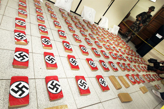 In the trunk of a station wagon, a man was carrying 204 kilos of cocaine in mold type bricks, all wore the nazi logo.