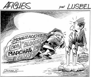 This cartoon is from El Diario, December 23, 2011. It shows Santa carrying a huge bag of “gifts” for the Bolivian population, while common citizen watches terrified… the bah reads: “strikes, chaos, blockades, marches, mobilizations, terror.