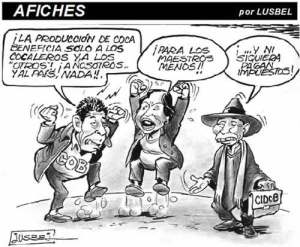 In this cartoon the leader of the major worker’s union says “coca production benefits only the coca growers and the ‘others’! and to us and the country, nothing!!” An old leader of the teacher’s association says “even less for the teachers!!” and a member of the CIDOB (the eastern indigenous association of Bolivia) says “…and they didn’t even pay taxes!”