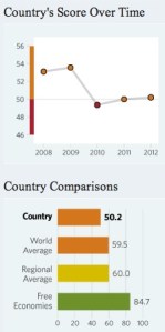 Bolivia’s economic freedom score is 50.2, making its economy the 146th freest in the 2012 Index. Its overall score is 0.2 point better than last year, with some improvements in three of the 10 economic freedoms, including freedom from corruption. Bolivia is ranked 25th out of 29 countries in the South and Central America/Caribbean region, and its overall score is below the world and regional averages.