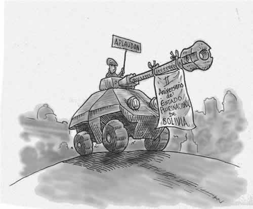 With the new ministers’ cabinet, many people coincide its is a political and conflict-prone one, in preparation for the 2014 elections and in a desperate move to regain control and acceptance. El Dia’s cartoon from January 24, 2012 shows power/force displayed, the sign reads “applause” and the banner “second anniversary of the pluri-national state of Bolivia”. It is the last sign of a governmental effort to re-write Bolivian history. For this government ideologist (many European “thinkers”, Venezuelan, Cuban and Bolivian “ideologists” have worked towards the creation of a symbol in the person of current president. The way he was sworn-in as president in Tiwanaku, and the excessive arrogance that nothing in our lifestyles is worth preserving is the cause of this demential intend to erase our past, our identity.
