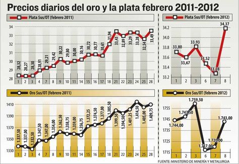 According to data from the Vice-Ministry of mining cooperatives, in the previous year the number of mining conflicts (illegal take overs) reached 58 (37 in La Paz, eight in Potosí, six in Oruro, three in Santa Cruz, three in Cochabamba and one in Pando). [The chart to the right shows silver and gold daily prices for February 2011 and 2012]