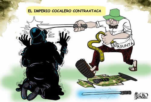 This cartoon is from La Prensa, February 9, 2012. It shows a coca grower from Asunta, La Paz, the other place where coca is grown. The title reads: “the coca grower empire strikes back” and the police is on his knees… not only Chapare, Cochabamba behaves lawless but so does the Yungas, La Paz. We do not need more signs, narco trafficking is beginning to set foot here, like they did in Colombia, Mexico and Afghanistan. And no one does anything to prevent or revert this nightmare, instead public TV channel and public radios across the country side say nothing but only praises to this government and their leader, the coca grower and current Bolivian president…