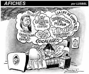 This cartoon shows how public opinion sees him in his sleep… having nightmares with a road that will but in half the TIPNIS, a host law that needs to be eliminated, environmental destruction, laws should be complied, coca growers, the Brazilian OAS company in charge of the construction of that road; next to his bed you can see the picture of his most influential friend, current president of Venezuela. From El Diario, February 9, 2012. The issue of the TIPNIS and new law will more likely to end the protection of the TIPNIS and will free more land to the coca crop that goes to the narcotraffick.