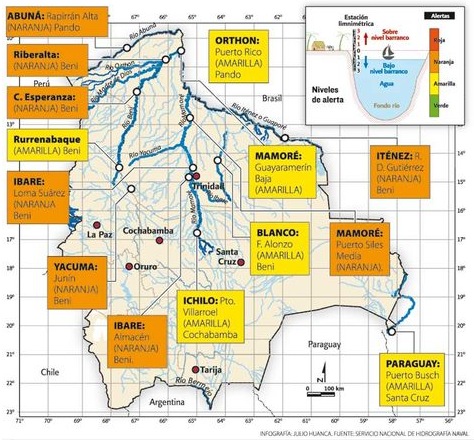 La Razon published on February 14, 2012 an interesting map with heavy rainfall and rivers nationwide that deserve attention: