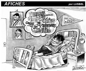 This is from El Diario, February 20, 2012. Where a leader of the Conisur, group who is pushing to build a road to cut in half the TIPNIS national park and indigenous territory. Photo and paraphernalia of current government is displayed in his bedroom while he dreams with “trips, salaries, houses, money, per diem” In direct line to the link that exists with these group and the desires of the government to have this road built.