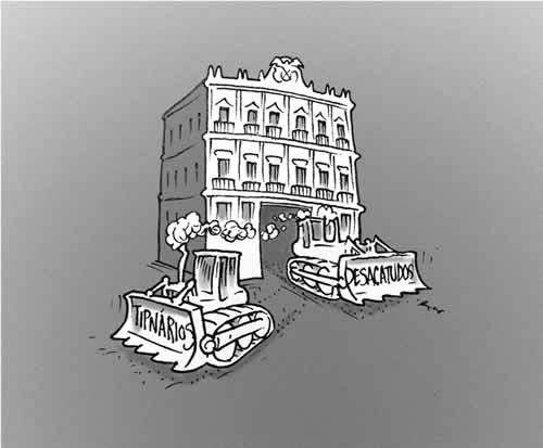 This cartoon appeared in El Dia, February 17, 2012. Two bulldozer are coming out of the presidential palace, one with the sign in reference to those supporters of the TIPNIS and the other with a sign in reference to those who will question the decision of the government, in contempt.