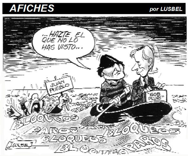 This one is from El Diario, February 29, 2012. Both current president and vice-president are sailing in turbulent waters filled with the word ‘blockades” in reference to the vast, prolonged and negative road blockades that spread out our nation. The president says “..pretend you didn’t see him…” in reference to the almost drowned “John People” that is… all of us!!