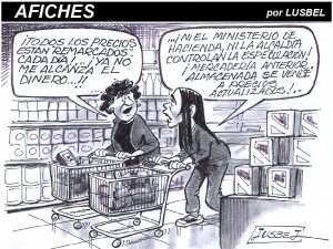 This cartoon is from El Diario, February 27, 2012. Two women talking while walking at a supermarket aisle: the first one says “all prices are re-marked every day!… money does not last..!!” and the other one replies “..not even the ministry of finance, nor the municipality control the speculation! first-in stored merchandise and sold to updated prices!..”