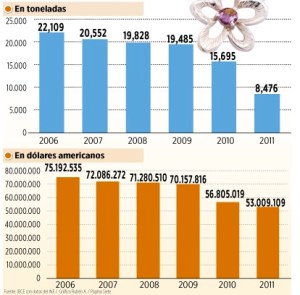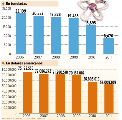The Chamber of Exporters (CAMEX) reported last year that the decline in sales has to do, in addition to the loss of the ATPDEA, with the increase in the price of the raw material, the gold and silver, and the economic crisis in Europe and the USA.