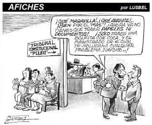 The sign reads “Pluri Constitutional Court” inside the infamous coca-reader-judge while one person is saying: “that is marvelous! what an advance! goof for the ‘MAS’! Now you don’t have to bring papers nor documents! Just bring a little bag of coca leafs and the judge Dr. G. Cusi will solve you any judicial problem…!